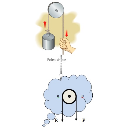 La polea es una de las máquinas simples, que estudió Galileo. Mediante la idealización geométrica, el objeto material se sustituye por una circunferencia de radio a y dos fuerzas P y R, con el punto de apoyo en el centro de la circunferencia. Así, el esquema coincide con el de la palanca y por tanto su funcionamiento se rige por la misma ley.