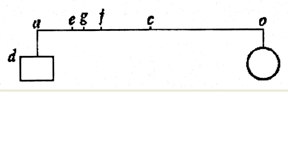 El esquema de la figura (un dibujo original de Galileo), a la derecha, muestra una esfera. En a se sitúa un peso de forma rectangular P. Y a la izquierda del punto de apoyo, las letras e, g f, representan posibles posiciones del peso P.