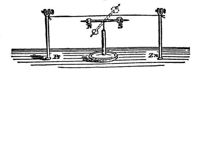 «Ahora, observen esto: aquí hay un trozo de hilo metálico al que voy a transformar en un «puente de fuerza»101, es decir, un conductor entre los dos extremos de la batería. Es sólo un hilo de cobre y por tanto no es de naturaleza magnética. Examinaremos este hilo con nuestra aguja magnética [Fig. 51] y, aunque conectada con un extremo de la batería, verán que antes de que el circuito se cierre no existe acción sobre la aguja magnética [línea continua en la Figura 4]. Pero observen cuando establezco el contacto; vean cómo la aguja gira [líneas de puntos en la Figura 4]