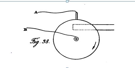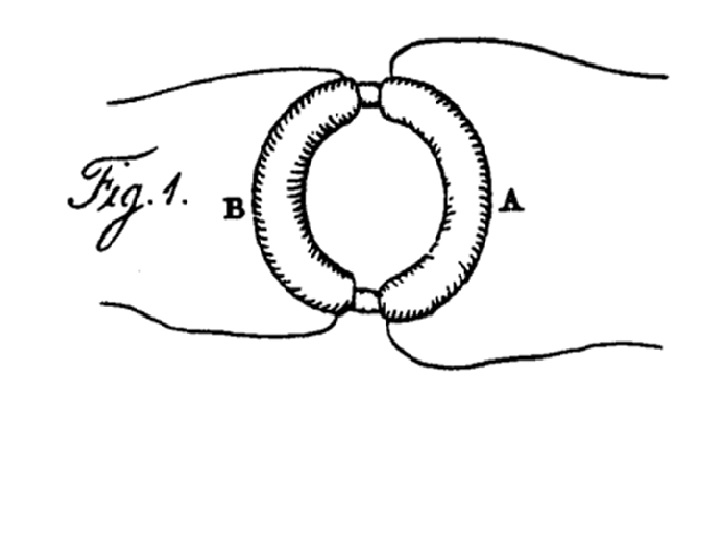 Uno de esos experimentos consistió en el montaje de laboratorio que representa de modo esquemático la Figura (ilustración original de Faraday). Consiste en un electroimán formado por un anillo grueso de hierro. En una mitad del anillo (A, en Figura hay un hilo conductor enrollado y conectado por sus extremos a los polos de una batería. La otra mitad (B) tiene un hilo conductor dispuesto de igual forma que el anterior, pero sus extremos, están conectados a un galvanómetro (dispositivo que registra el paso de corriente).