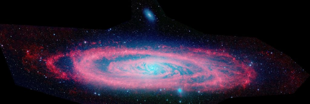 Galaxia Andrómeda, de forma espiral. Su halo tiene un diámetro de doscientos veinte mil años luz y de unos ciento cincuenta mil años luz entre los extremos de sus brazos.