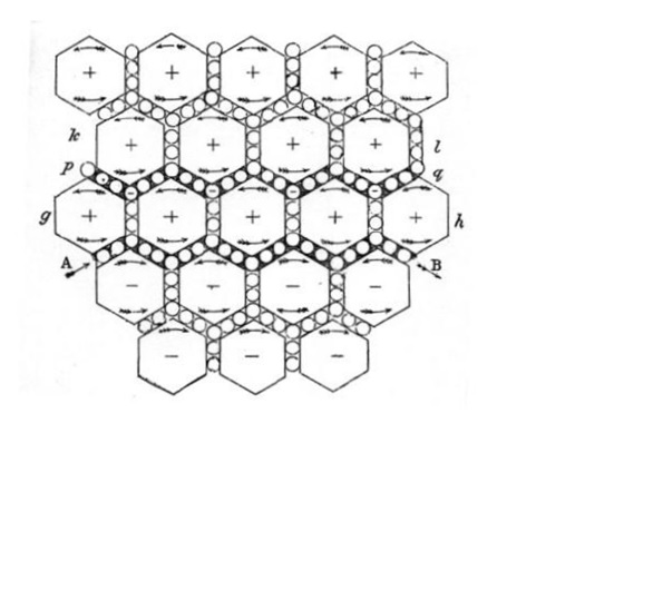 El complejo artefacto fue sugerido por W. Thomson quien solía recurrir a analogías mecánicas. Así, Maxwell concibió el artilugio ilustrado en la Figura 9 (reproducción del dibujo original de Maxwell). Está formado por dos clases de piezas giratorias, unas mayores de forma hexagonal que representan «vórtices moleculares», cuyos ejes tienen la dirección de las «líneas de fuerza» (o sea perpendiculares al plano del dibujo); los rodillos, de menor tamaño, pueden girar libremente y están situados entre dos hileras de «vórtices» e impiden la fricción entre las piezas hexagonales, permitiendo el giro de los vórtices, que, de acuerdo con el convenio adoptado por su autor, unas giran en sentido contrario a las agujas del reloj (+) y otras a favor (-).