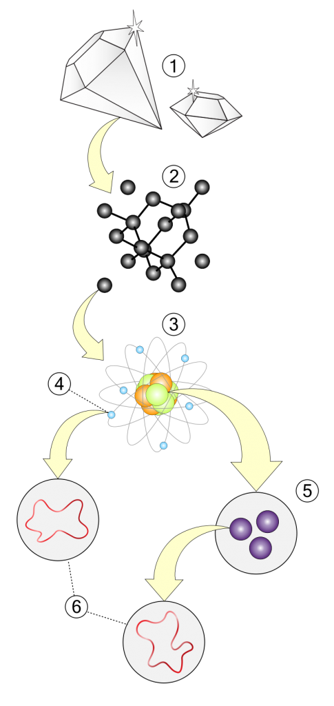 Esquema interpretativo de la supuesta estructura de la materia. Es decir, se conciben como entidades físicas básicas, que forman parte de partículas elementales, como electrones e incluso los «quarks». Partículas que a su vez constituyen los átomos, los cuales dan lugar a la estructura molecular de la materia.